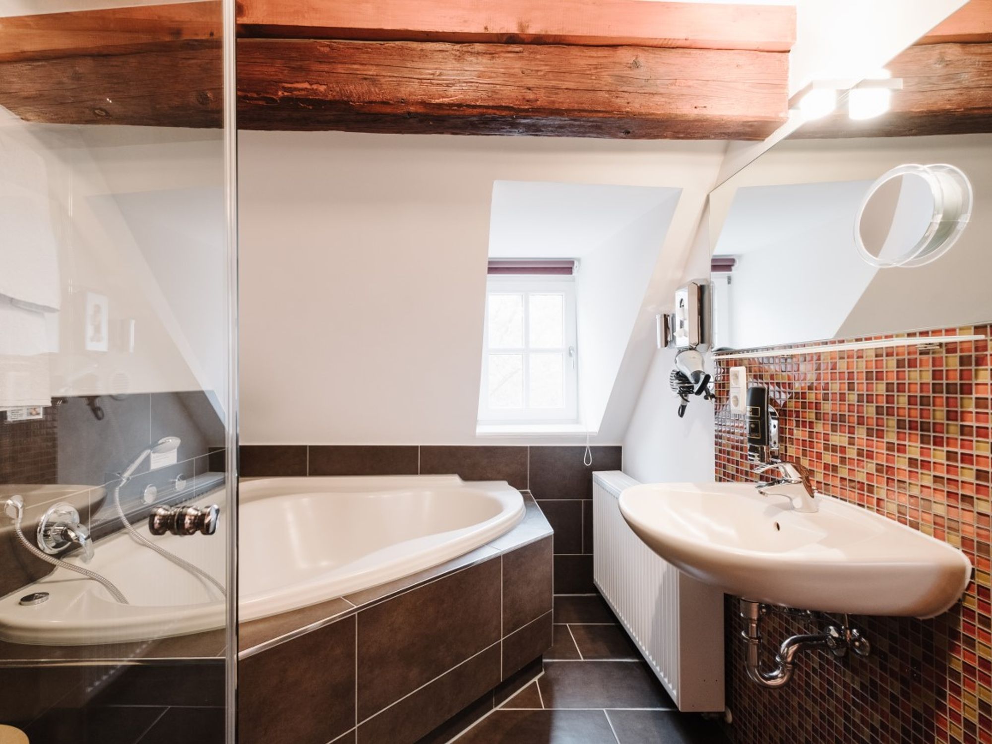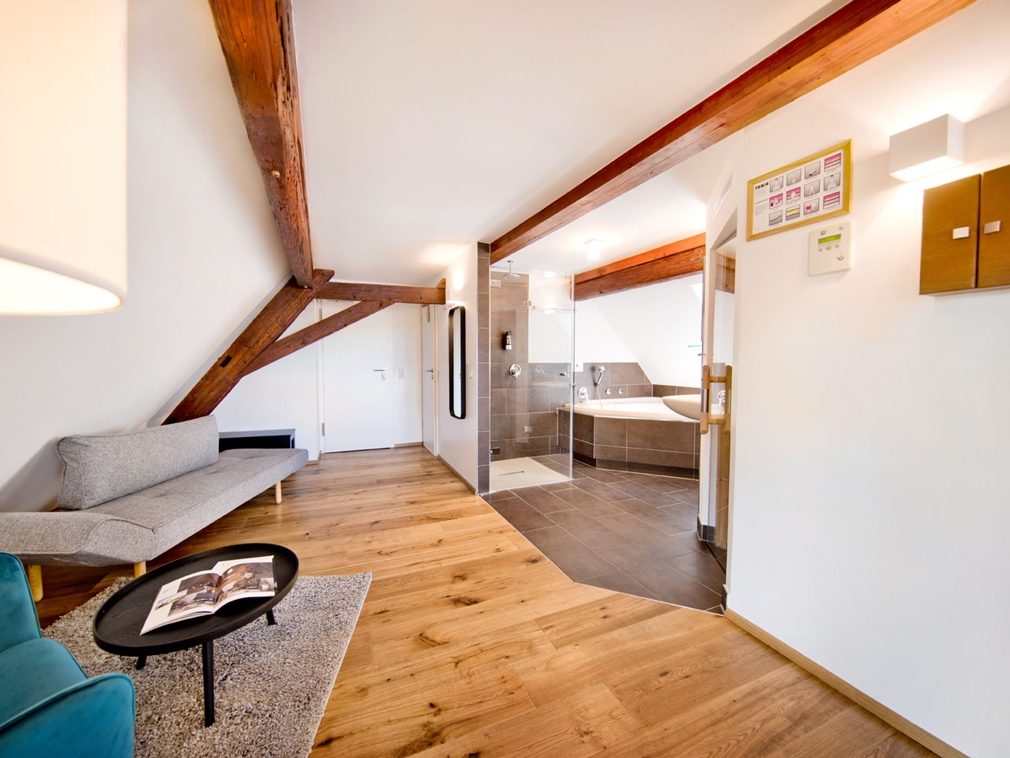 The "SPA Traumsuite" invites you to relax in a modern, home-like atmosphere. With 38 spacious square meters, half-timbered, sloping ceilings, and floor-deep windows, this suite provides a feeling of luxury with a magnificent view of the paddocks. The whirlpool bath promises enjoyable moments of well-being. A special highlight of the "Spa Dream Suite" is the private sauna in the room. For sweet dreams.