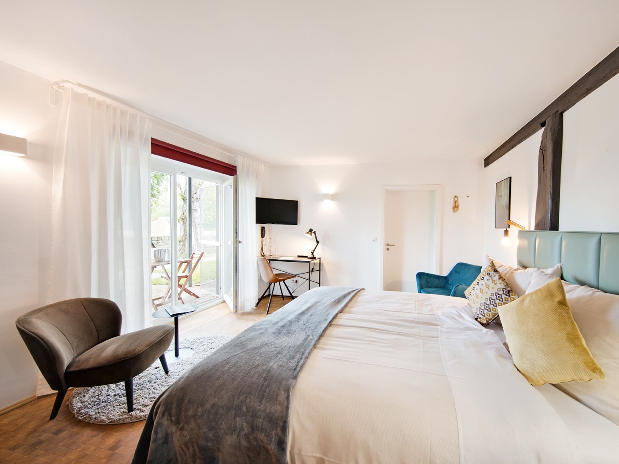 Some of the double rooms in the "Tagträumer", or daydreamer, category are barrier-free and all have a terrace with a view of the nearby paddocks. On these room of more than 20 sqm, our guests will find plenty of space to feel good. In combination with the old half-timbered house, our "Tagträumer" rooms offer a homely flair with a modern touch. This is partly reinforced by the open stone walls. Live your dream!
