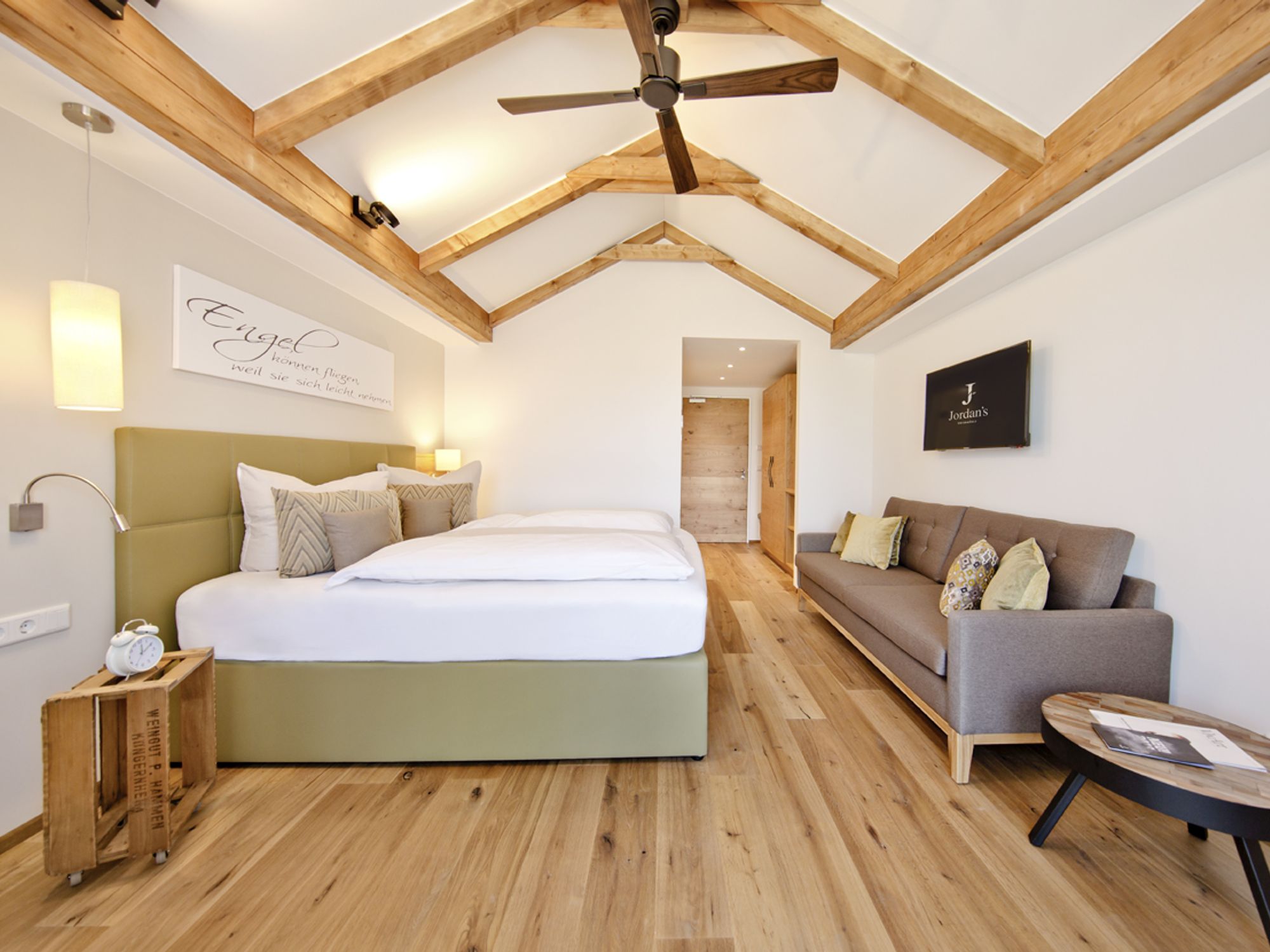 26 m² zum Wohlfühlen, Träumen und Genießen. Unsere Doppelzimmer „Wolkenblick“ gewähren herrliche Ausblicke auf die Felder und die Weite des Himmels. Treten Sie hinaus auf den Balkon und atmen Sie die frische Landluft tief ein. Im Zimmer trifft ländlicher Charme auf modernen Schick. Ein bequemes Boxspringbett verspricht traumhaften Schlaf. Die individuelle Möblierung ist funktional gehalten und verspricht dank warmen Farben und edlen Holzoberflächen einen Ort der Geborgenheit und Ruhe.