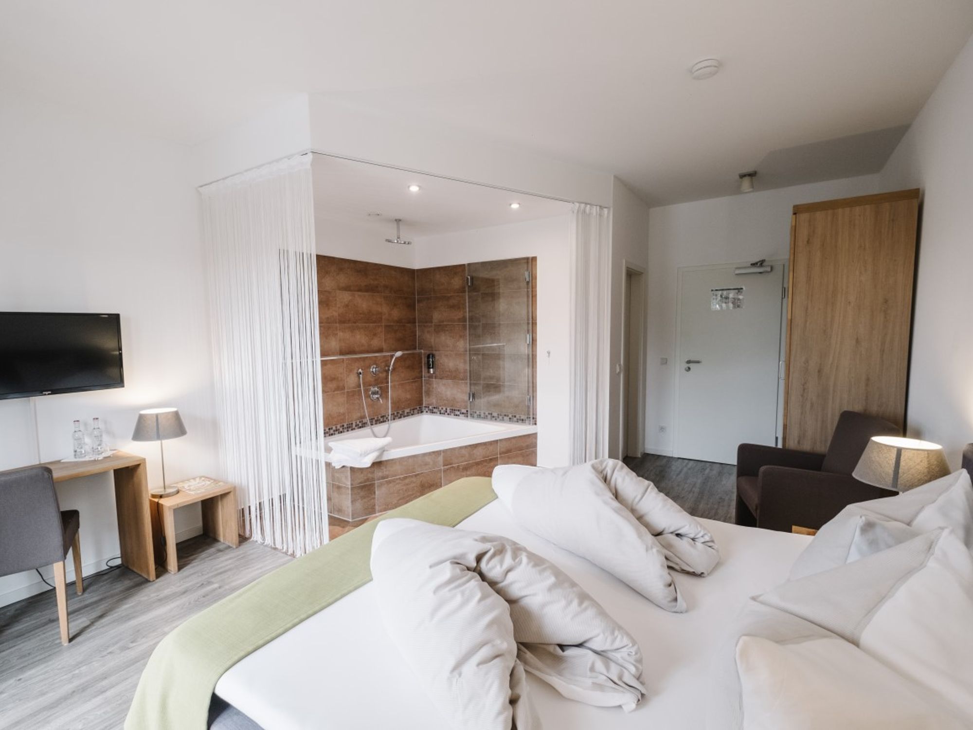Das Ambiente der Studiozimmer „Zeitgeist“ ist modern-reduziert gehalten und bietet ein zeitloses Flair zum Zurücklehnen und Genießen. Die große Badewanne und die Regendusche versprechen einen Hauch von Luxus auf dem Zimmer. Die Studiozimmer „Zeitgeist“ sind barrierefrei zugänglich und bezaubern mit Blick über die umliegenden Felder.